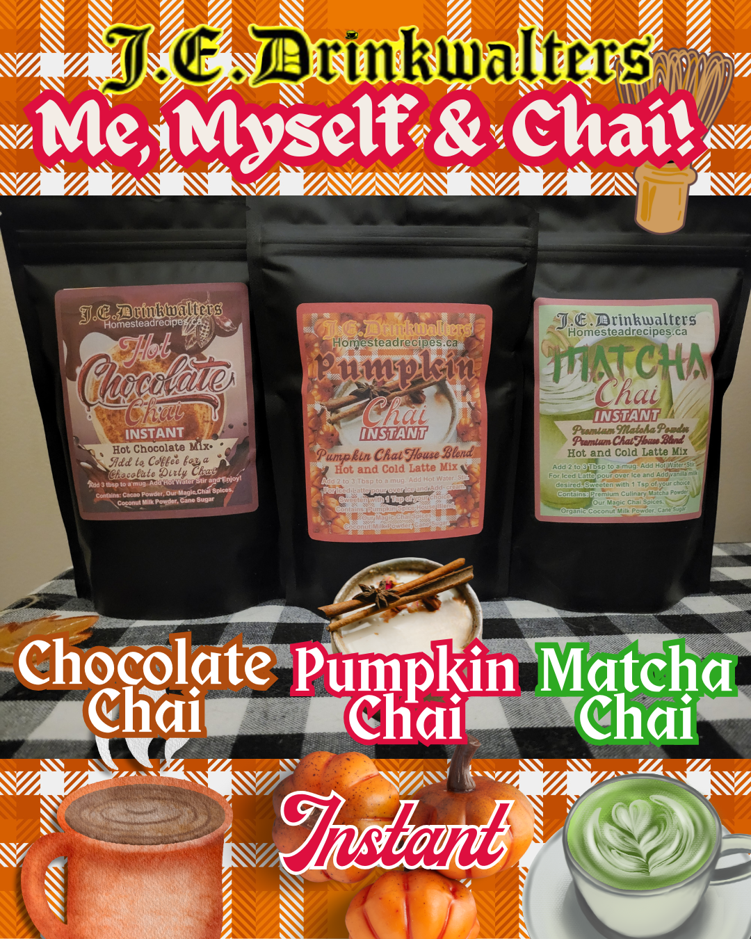 Our 3 boutique product lines: Organic & Wildcraft Holistic Teas, Instant Low Sugar Pumpkin Chai, Hot Chocolate Chai and Matcha Chai...just handmade just in time for Fall!